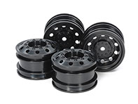 ディスク面のボルト形状も再現した、オンロードレーシングトラック用のホイールです。実車でよく見られるブラックカラー。フロント・リヤ各2本ずつをセットしました。オンロードレーシングトラックタイヤと組み合わせて使います。