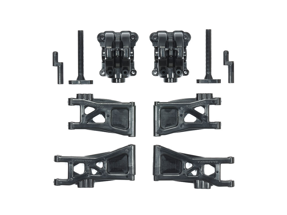 キットの標準装備パーツに比べて樹脂の材質を強化したギヤカバーとロワサスアームです。前後ダンパーステーの取り付け剛性を高め、足まわりも強化。TT-02B フルベアリングセットとTT-02B ターンバックル オールセットとの併用が効果的です。