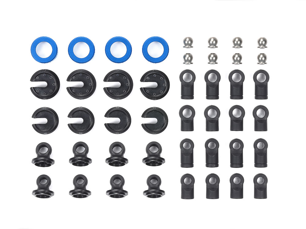 TRF-スーパーショートビッグボアダンパーの基本性能を高め、セッティング幅を広げるパーツです。標準装備の樹脂素材と形状を見直して強度アップ。アルミ製ダンパーキャップはブルーカラー、ダンパー用ボールナットはφ5.8mm径。ダンパー4本分のパーツをセットしました。