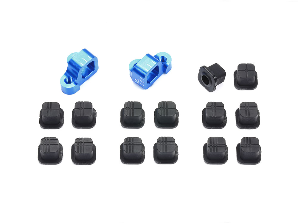サスシャフトの取り付け部を樹脂製ブッシュの別パーツで構成した、左右別体型のアルミ製サスマウント。ブッシュを取り換えることでトー角、車幅、ロールセンター、スキッド角の繊細なセッティングが可能です。※サスマウントを取り付ける際に、シャーシに干渉する場合は加工して取り付けてください。