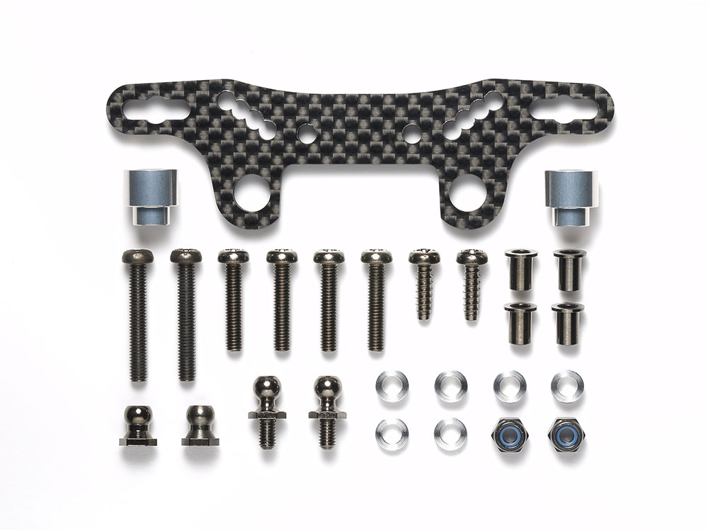 ITEM53571 TRFダンパーとのコンビがベストマッチの、高剛性3.5mm厚カーボン製ダンパーステーです。ダンパー取り付け位置を4ヶ所設定し、前後に使用可能。ITEM54874 TT-02アジャスタブルアッパーアームの取り付けもOK。もちろん、TT-02シャーシに標準装備のフリクションダンパーも取り付け可能です。※前後に装着する場合は本製品が2セット必要になります。