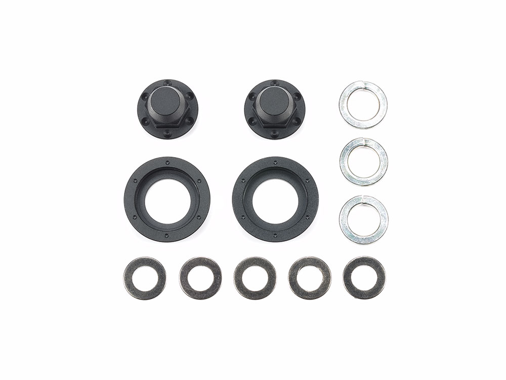 キット標準の4mmフランジナットに換えて使用。ハブカラーをハブナットにゴム系接着剤で固定し、キットの十字レンチで締め込みます。実車をイメージしたアルミ製のハブナットが仕上がりのリアリティをさらに高めます。ハブナットとハブカラーはマットブラック仕上げ。1/14RCビッグトラックシリーズのトレーラーヘッド各車をはじめ、パネルバンやダンプトラック、ティンバートラックの前輪。シングルタイヤのセミトレーラーに使用可能です。