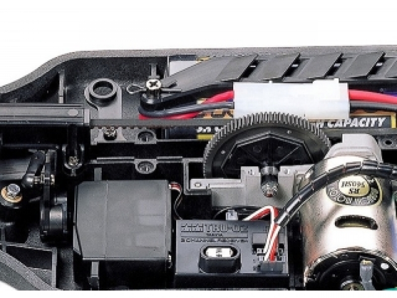 3、 スパーギヤをセンターに配置して、前後のドライブベルトを等長化。また、駆動部分は樹脂パーツでカバー、走りの信頼性を高めます。