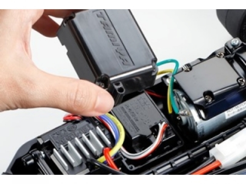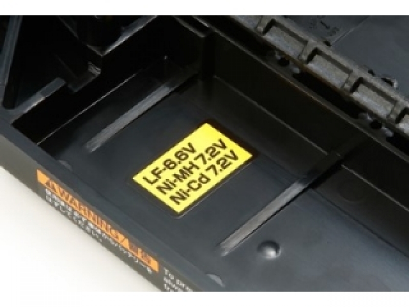 9、 走行用バッテリーはシャーシ左サイドに縦置き。レーシングパックはもちろんLF3700-6.6Vなどの角形バッテリーも搭載可能。
