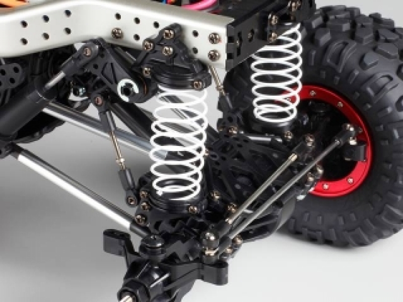 【 基本スペック 】 ●全長435mm ●全幅265mm ●全高215mm ●車体重量2,309g (RCメカ・バッテリー含まず) ●ホイールベース=288mm ●トレッド=前後とも208mm ●タイヤ幅/径=前後とも57/125mm ●フレーム=アルミ製サイドメンバーに樹脂製クロスメンバーを組み合わせた高剛性ラダーフレーム ●駆動方式=縦置きモーター・シャフトドライブ4WD ●デフギヤ方式=前後:3ベベル(基本セッティングはデフロック) ●トランスファー:プラネタリータイプ ●サスペンション=前後とも4リンクリジッド ●ダンパー=前後ともCVAオイルダンパー ●ギヤ比=32.4:1 ●スピードコントローラー=ESC仕様(別売) ●モーター=RS540タイプ