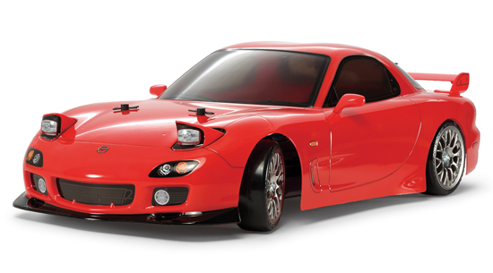 ロータリーエンジン搭載のピュアスポーツカーとして、生産が終了した現在も熱狂的なファンを集めているマツダRX-7。中でも3代目モデルのFD3Sはドリフトマシンとしても高い人気を誇っています。そのFD3Sを1/10スケールで再現した電動ラジオコントロールカーの組み立てキットです。低いボンネット、小さく絞りこまれたキャビン、滑らかで張りのある前後のフェンダーなど、ダイナミックな曲面構成のフォルムをリアルに再現したボディはポリカーボネート製。ポップアップした状態のライトケースやドアミラー、リヤウイングは樹脂製パーツとしてスタイルを引き締めます。シャーシはドリフト走行が手軽に楽しめるシャフトドライブ4WDのTT-02Dを採用しました。