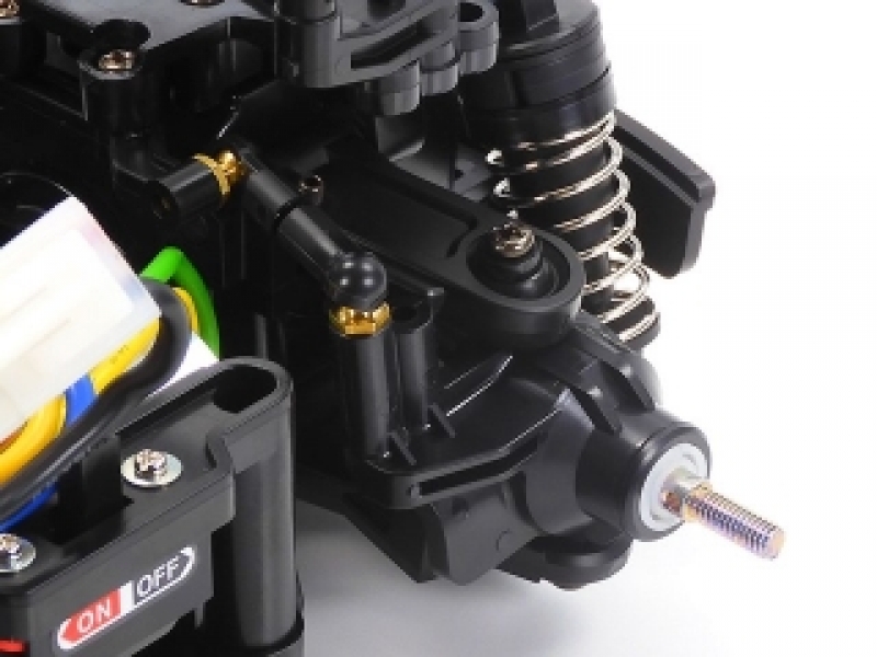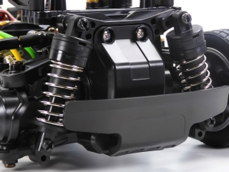 【 基本スペック 】 ●全長374mm、全幅168mm、全高140mm ●ホイールベース210mm(ショート) ●トレッド 前後とも140mm ●タイヤ幅/径=フロント25/55mm 、リヤ25/59mm ●フレーム=バスタブタイプ ●駆動方式=ミドシップモーター・後輪駆動 ●デフギヤ=樹脂製4ベベルタイプ ●ステアリング=3分割タイロッド式 ●サスペンション=4輪ダブルウィッシュボーン ●ダンパー=前後ともフリクション ●ギヤ比=5.83:1(キット標準29Tピニオン使用時) ●モーター=540タイプ ●スピードコントローラー=ESC仕様(別売)