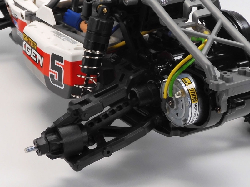 【 軽快な走りで性能アップにも対応した後輪駆動シャーシ、DT-04採用 】シンプルな構造で組み立てやすく、軽快な走りが楽しめる後輪駆動のバギーシャーシがDT-04です。走行用バッテリーを縦置きし、モーターを車体後端に搭載して駆動輪に充分荷重がかかる構造を採用。砂や小石の侵入を防ぐ密閉式ギヤボックスにはスムーズなコーナリングを生み出すデフギヤを内蔵しました。また、ホイールベースは操作性を重視した265mm、走行安定性を重視した280mmの2サイズが選べるのも特徴。足まわりはCVAオイルダンパーを装備したロングアームのダブルウィッシュボーン4輪独立。フロントアームに22.5度のスキッド角を付けて、操縦性とギャップ走破性をバランス。さらに、3分割ワイパーを採用したステアリング系によりクセのない操縦性を発揮します。タイヤは前輪が方向性に優れるグルーブド、後輪は路面を選ばずグリップ力充分なスクエアスパイクを装着しました。