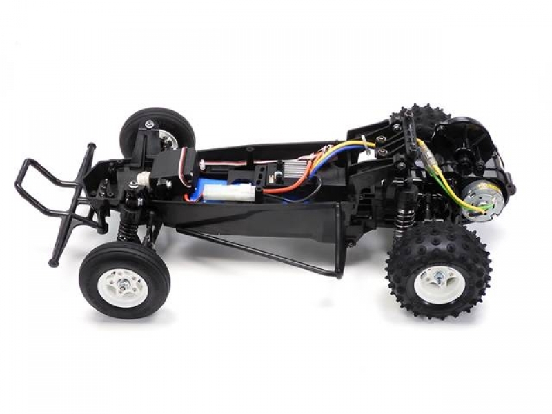 【 軽快な走りを生み出すダブルウィッシュボーン4独サスペンション採用 】 軽量で好バランスな後輪駆動シャーシ構成を採用。スリムなABS樹脂製バスタブフレーム中央の低い位置に走行用バッテリーを縦置きし、その上にRCメカを搭載しました。サスペンションは、オフロードでの走破性が高いダブルウィッシュボーン4倫独立。前後ともアッパーIアーム、ロワHアームの構成で、CVAオイルダンパーを装備。アッパーアームにターンバックルシャフトを使用してキャンバー角の調整ができ、荒れたオフロードでも軽快な走行が楽しめます。また、モーターをリヤエンドにセットした密閉式ギヤケースにはデフギヤを内蔵。ドライブシャフトは一般的なドッグボーンタイプとした信頼性の高さもポイントです。加えて、駆動系はフルベアリング仕様。より高性能なオイルダンパーやボールデフなどの別売りパーツを組み込んでチューンナップも楽しめます。