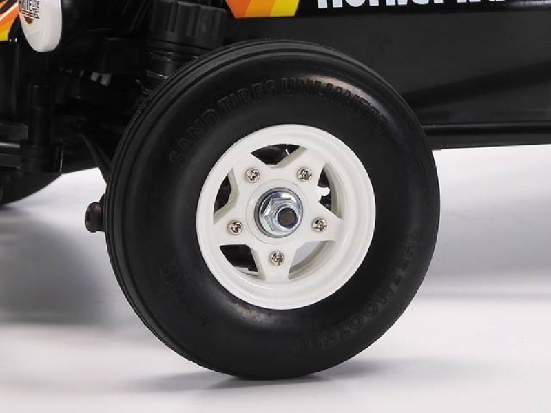 【 足まわりをグレードアップした40周年記念モデル 】 1984年に登場して2WDオフロードRCカーのブームを生み出したホーネットのシャーシ性能を高めたアップグレード版です。バスタブタイプフレームの基本的な構成はそのままに、足まわりを強化。オイルダンパーを装備したダブルウィッシュボーン4輪独立サスペンションを採用。オフロード走行につきものの砂や小石の侵入をシャットアウトする密閉式ギヤボックスを装備。スムーズなコーナリングを生む3ベベルギヤタイプのデフギヤも内蔵しました。ホイールは前後とも立体感ある組み立て式の3ピースタイプ。前輪は方向性に優れたグルーブドタイヤ、後輪はハイグリップなスパイクタイヤを装着。ボディは軽くショックに強いポリカーボネート製。オレンジ/イエローのファイヤーパターン、デビュー40年を記念したゼッケン40、車名ロゴ、マスコットマークなどはステッカーを用意しました。