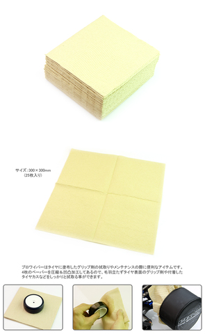 プロワイパーはタイヤに塗布したグリップ剤の拭取りやメンテナンスの際に便利なアイテムです。4枚のペーパーを圧縮&凹凸加工してあるので、毛羽立たずタイヤ表面のグリップ剤や付着したタイヤカスなどをしっかりと拭取る事ができます。