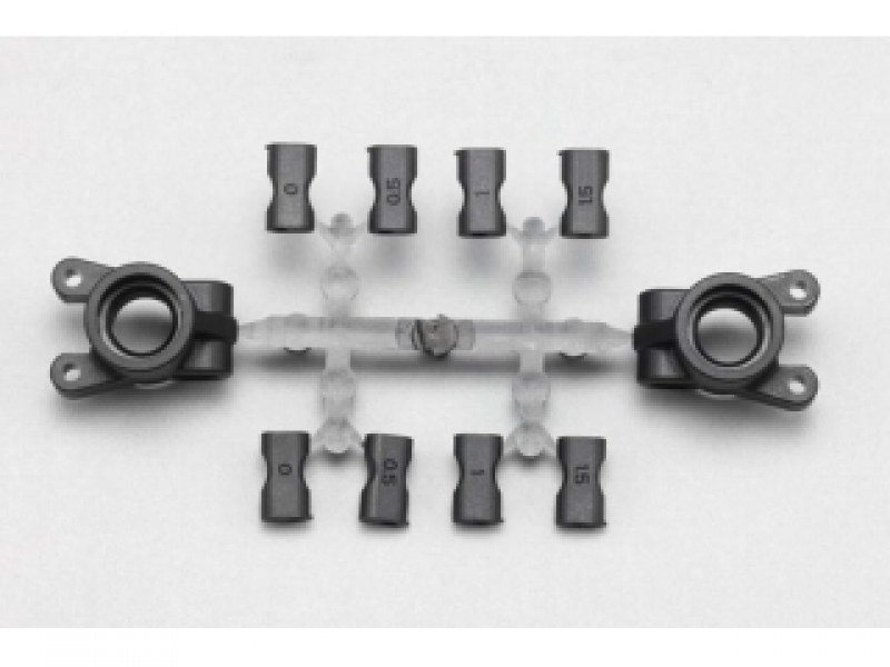 YZ-2DTM3/CAL3用のリヤハブキャリアです。やや硬めの樹脂を使用してレスポンスを向上させています。Φ3mmのサスピンに対応したブッシュは、入れ替えることによりロールセンターを調整可能です。