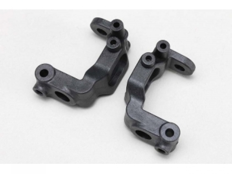 硬度の高いグラファイト混入樹脂で成形されたBD12用フロントステアリングハブキャリアです。ボディステフナープレートを装着するための取付穴がモールドされています。左右各1個入り。