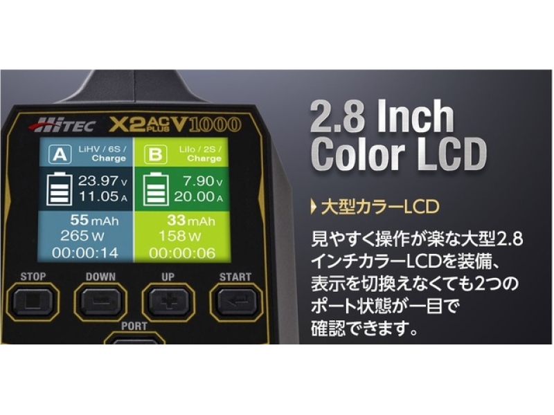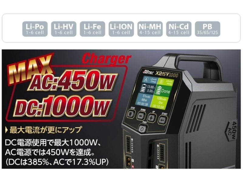 対応バッテリー:Li-Po / Li-Fe / Li-ion / Li-HV : 1~6セル、Ni-MH / Ni-CD : 4~15セル、 PB : 3S/6S/12S