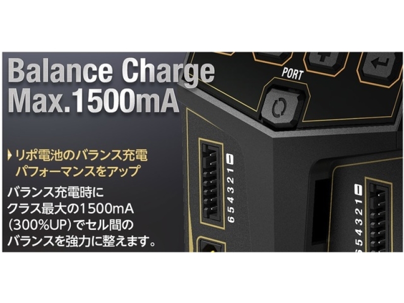 ・バランス充電時にクラス最大の1500mA(300%UP)でセル間のバランスを強力に整えます。