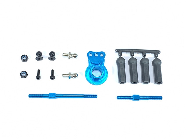 ターンバックルは A7075-T6 製。ガタを減らしステアリングレスポンスが向上します。M3×5mm ピロボール、M2 ピロボール、ロッドエンド付属。ブルーとブラックの2色