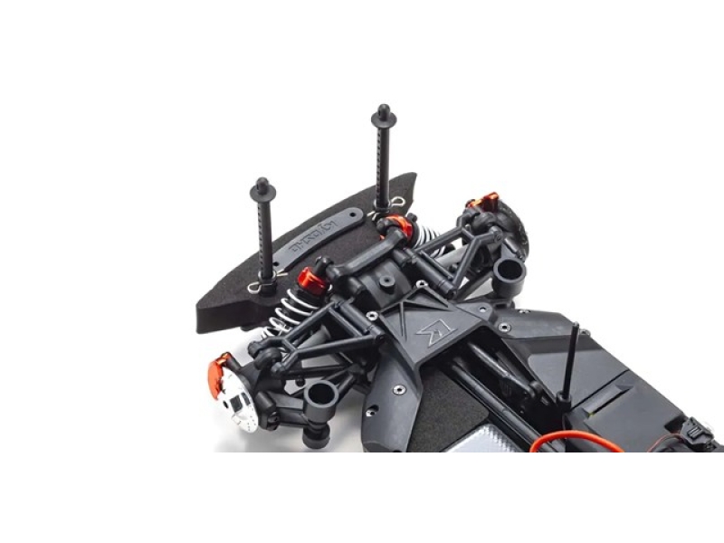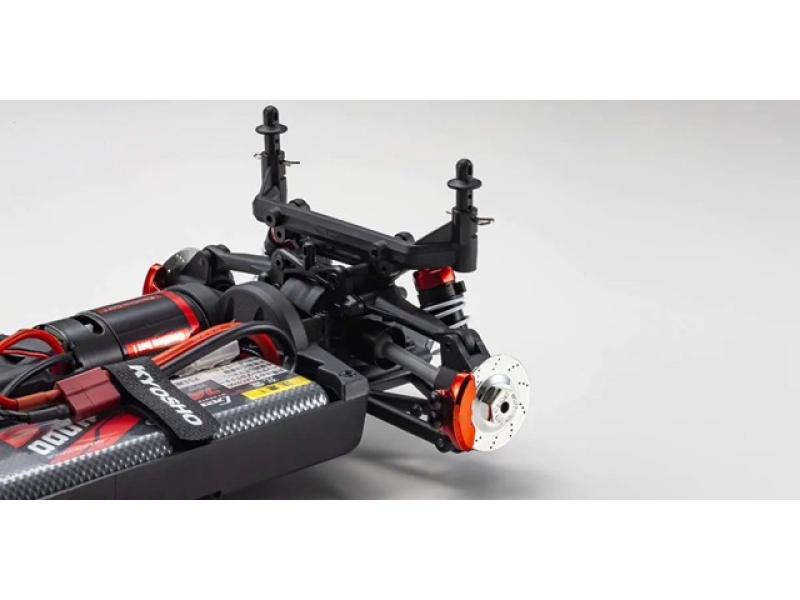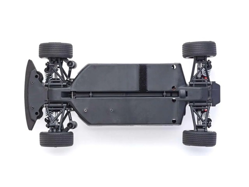 パーツ点数を少なくすることでメンテナンス性を高めた軽量シャシーはシンプルなデザインながら、前後のステフナーや各部に設けた補強リブ、そして使用する材質の変更など細部にわたるブラッシュアップで高い強度と走行に適した剛性を確保。加えて、極力シンメトリーとなるようなシャシーデザインとしたことで、前後バランスに優れるサスペンションや車格に見合ったパワーソースとの相乗効果によるクセのない素直な操縦性も獲得しています。そのうえで前後ギヤデフ、オイルダンパー、フルボールベアリングを採用。高い耐久性と耐衝撃性を確保して、ドライバーをしっかりとサポートします。また、標準装備の0mmオフセットのブレーキディスク型ホイールハブ以外に(+5mm)オフセットのホイールハブを同梱して190mm幅と200mm幅の両ボディに対応するとともに、オプションパーツ(別売)としてホイールベースが260mmのショートメインシャシーとショートセンターシャフトを用意。これらのパーツを組み替えることによって、付属ボディ以外の1/10スケールボディが搭載可能となります。しかも、すべてが揃った工場完成のレディセットですので走行用バッテリー、走行用バッテリー用充電器、送信機用電池を別途購入すれば、すぐに走行が楽しめます。