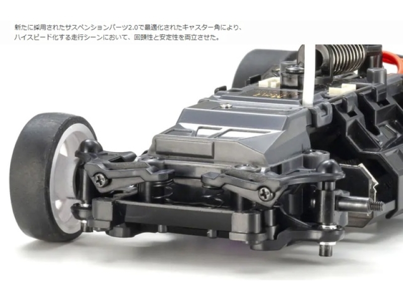パッケージを開封後、バッテリーを車体と送信機に入れればすぐに本格的なR/Cカーの操縦を満喫できる、それが京商製レディセットの魅力です。中でもスモールスケールのミニッツレーサーは、室内で走行可能な手軽さもあって、R/Cカーの経験が少ない人にも最適といえます。そんなミニッツレーサーの基幹モデルとでもいうべきリア2輪駆動シャシーのレディセット「ミニッツRWD」が新シャシーにリニューアルされます! これまでのレディセットではリア2WDミニッツレーサーの第3世代MR-03シャシーを使用していましたが、今回のリニューアルでは、2023年にデビューした第4世代のMR-04シャシーがベースになります。基本設計はMR-03を引き継ぎつつ、低重心化やステアリング回りの設計変更によって大幅な進化を果たしたMR-04は、ミニッツ最上級モデルのEVO2でデビューし、圧倒的な速さと操縦性のよさを披露しています。そのMR-04シャシーにレディセット用のR/Cユニットを搭載して、ディスプレイモデルに匹敵するクオリティの完成済みボディを組み合わせました。レディセット化にあたってもシャシー各部の材質変更はなく、クオリティはハイエンドモデルそのままです。モーターは扱いやすい130クラスのブラシモーター、送信機はR/Cカーでポピュラーなステアリングホイール&ガングリップ型のSyncro KT-531Pと信頼性は抜群。シャシーと送信機にそれぞれ単4型のアルカリバッテリー4本を搭載すれば走行可能状態になります。標準状態で走行を楽しむだけでなく、豊富にそろったミニッツ用オプションパーツの使用により、トップクラスのレースでも通用するレベルのマシンに仕上げることもできます。操縦にチューンナップ、さらには観賞用としても楽しめるミニッツRWDは、MR-04シャシーへのリニューアルによってオーナーをより高いレベルの本格R/Cカーの世界に誘ってくれます。