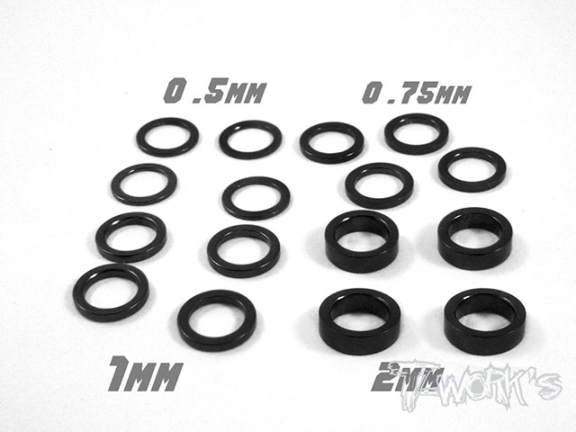 内径5x外径6.9mmのアルミ製シムで、厚みが0.5/07.5/1.0/2.0mmの各4枚入りとなります。