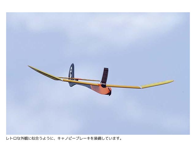 「ダンデライオン88」は翼長2235mm (88インチ)のレトログライダーです。準生地完成機なので、好みのフィルムを貼って仕上げることができます。レトロな外観に似合うようにキャノピー部分が垂直に開き、エアブレーキとなる仕組みを採用。