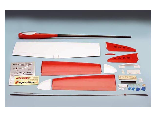 「パプリカ3」は2mクラスARF完成モーターグライダーとしては大幅な軽量化とロードラッグを実現、F5J2000にも使える戦闘力を備えた機体です。98度の狭いV角度はスライドを最小限に抑え、3段上反角は小さなサーマルを確実にとらえる旋回が可能です。