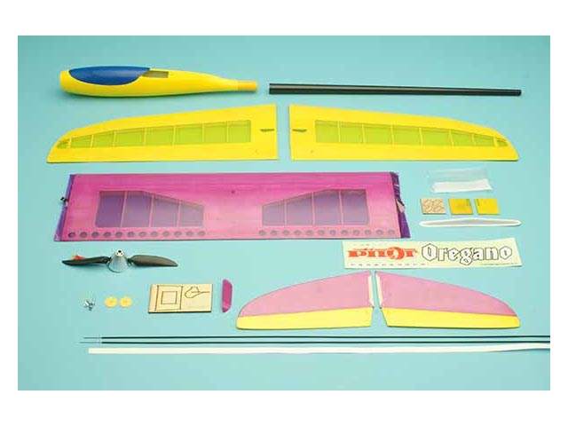 フィルム貼り済み完成機「オレガノII」は1.4mクラスのモーターグライダーです。前部胴体ポッドはグラス製ゲルコート仕上げ、後部胴体ブームはテーパーカーボンパイプ製とすることで、機体全体の剛性が向上し、それぞれの舵がリニアに反応します。また、エルロン形状、翼形、主翼平面形、上半角などを細かくチューンアップし、その滑空性能と運動性には定評があります。機首は38mmスピンナーのアポロモーターがぴったり合う設計になっています。