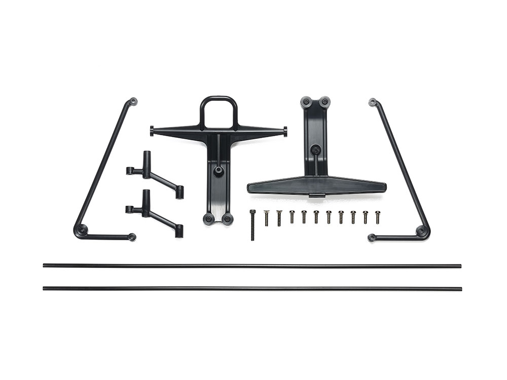 車体のフロント部、サイド部を保護するバンパー部品です。往年の1/10RCバギーに装着されていたフロントバンパーやサイドガードをモチーフに、タムテックギア用にアレンジ。バンパーはフラットバー形状とアニマルバー形状の2種類を用意しました。取り付け用ビスやアンテナパイプ(ブラック)もセット。