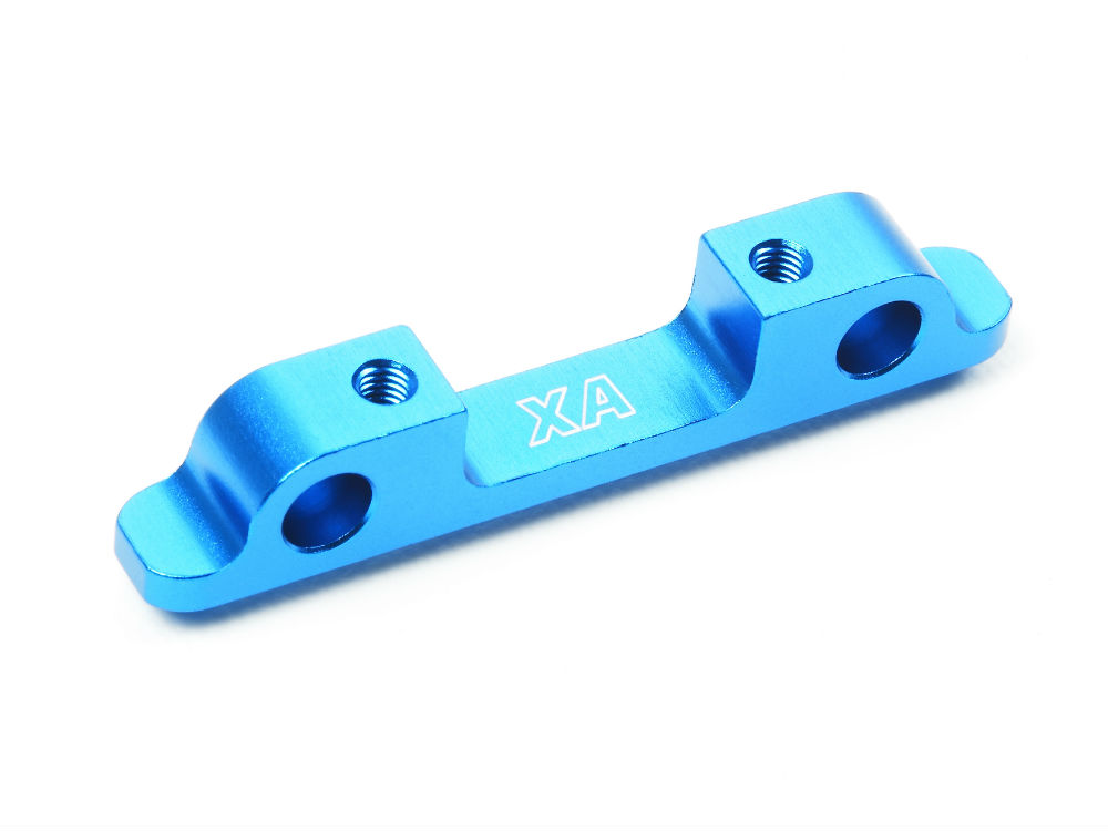 TRF201のキットに標準装備されているJ5部品に換えて使用。ハードな走行でもアームを確実に固定するアルミ製です。標準装備のJ1部品またはITEM54243 TRF201アルミリヤサスマント(リヤ3.0)を使用して、サスアームのトーインを3.5度に設定。走行安定性を高めます。また、スペーサーを併用することで、微細なセッティング変更が可能です。