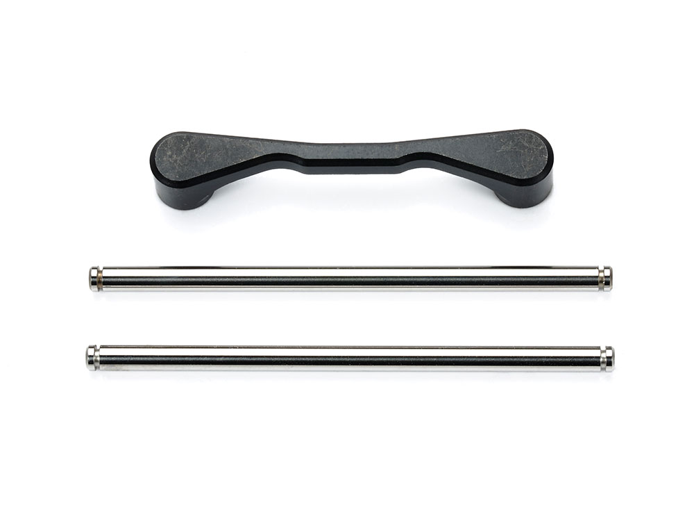 標準装備のU字シャフトに換えて使います。スチール製サポートブリッジと2本のステンレスサスシャフトで構成。サスアームのガタを減らして滑らかな作動を生み出します。また、左右別々にサスアームを組み立てられるので、メンテナンス性もアップします。