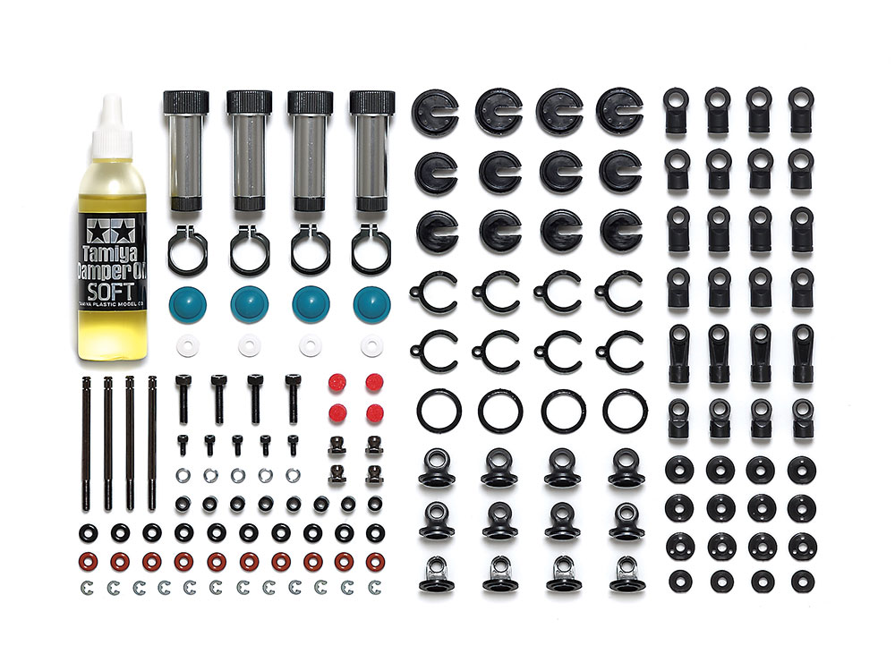 アルミ製シリンダー(シルバー)4本、シリンダーキャップ(ガンメタ)4個、Oリングキャップ4個、クランプ式スプリングリテーナー4個、#400のオイル付き