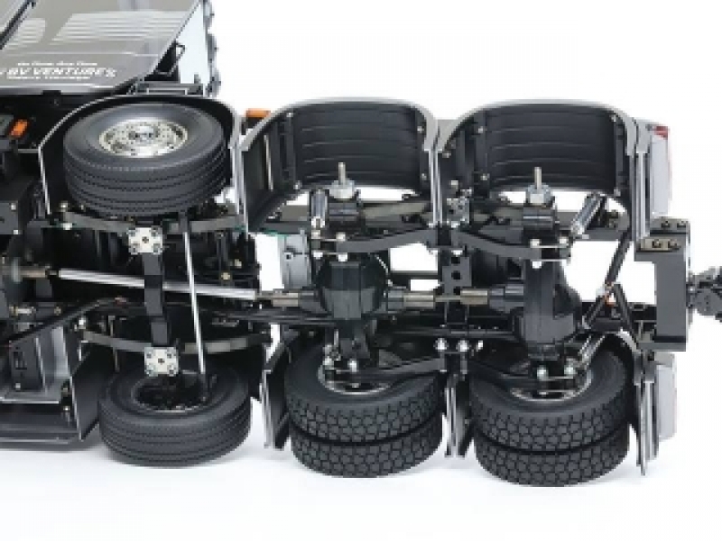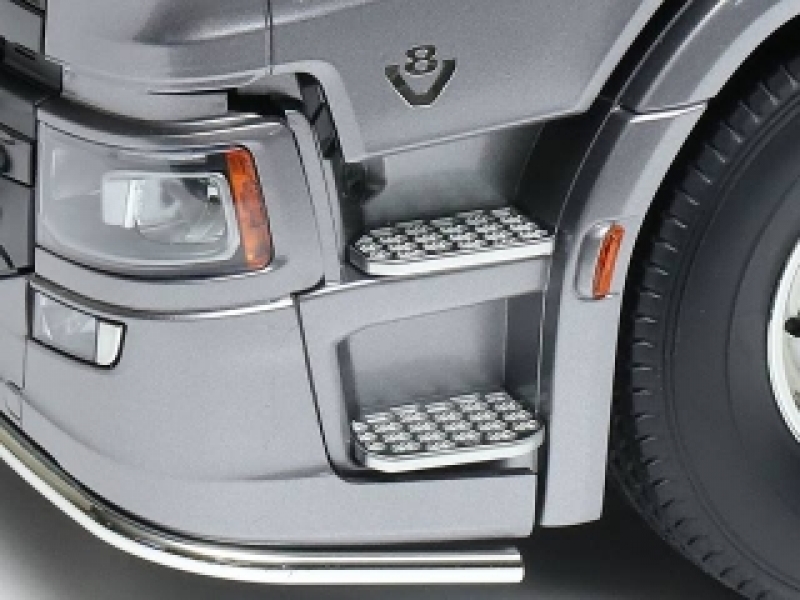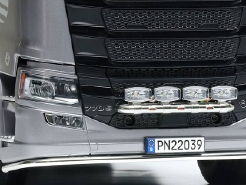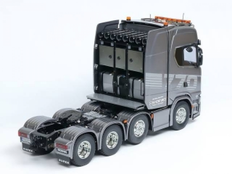 【 カスタムパーツもよく似合う、8輪重トレーラーヘッド 】 大型トラックメーカーとして知られるスウェーデンのスカニア社。同社が2016年に発表した新世代モデルの最上級グレードがSシリーズです。中でも、2020年に追加された、770馬力を誇るV8ターボディーゼルエンジンを搭載する、前2軸操舵・後2軸駆動の8輪重トレーラーヘッド、スカニア 770 S 8x4/4の電動RCカー組み立てキットです。精密金型を使用して、ハイルーフ仕様を実車そのままにモデル化。ドライバーを囲むようなラウンド形状のダッシュボードなどが備わるリアルな室内に加え、ヨーロッパで人気のカスタムパーツなども再現しました。シャーシはアルミ製チャンネル材を使用したラダーフレーム。前2軸を1個のサーボで操舵し、モーターのパワーを3速ミッションを介して後輪に伝達します。さらに、第2軸には車軸を持ち上げる機能、「リフトアクスル」を搭載。手動操作でタイヤを上下させることができます。