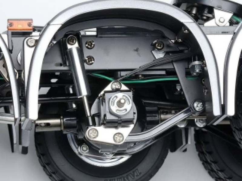 【 基本スペック 】 全長610mm、全幅196mm、全高320mm、車体重量=約4.2kg(オプション除く) ●ホイールベース=183+109+103mm ●トレッド・前/後=155/138(ダブルタイヤトレッド)mm ●シャーシ形状=(アルミ+樹脂製)ラダーフレーム ●サスペンション=前後ともリーフリジッド ●キャスター角・前/後=0°/0° ●キャンバー角=前後とも 0° ●トー角=前後とも0° ●ダンパー=アルミダミーダンパー ●駆動方式=後輪2軸駆動 ●トランスミッション=常時噛合い式3段変速(プロポ操作により変速) ●ギヤレシオ=1速 32.49:1、2速 17.66:1、3速 10.66:1 ●デフギヤ方式=3ベベルデフ ●モーター=TRマイティチューンモーター(35T) ●タイヤ幅/径=フロント:30mm/85mm 、リヤ:22mm/84mm