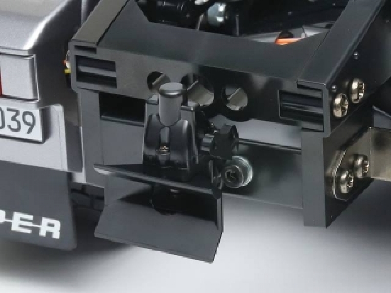 17、 シャーシ後端にはポールトレーラー牽引用のピントルフックを用意。首振りの自由度をアップし、連結時のオートロック機能まで再現しました。