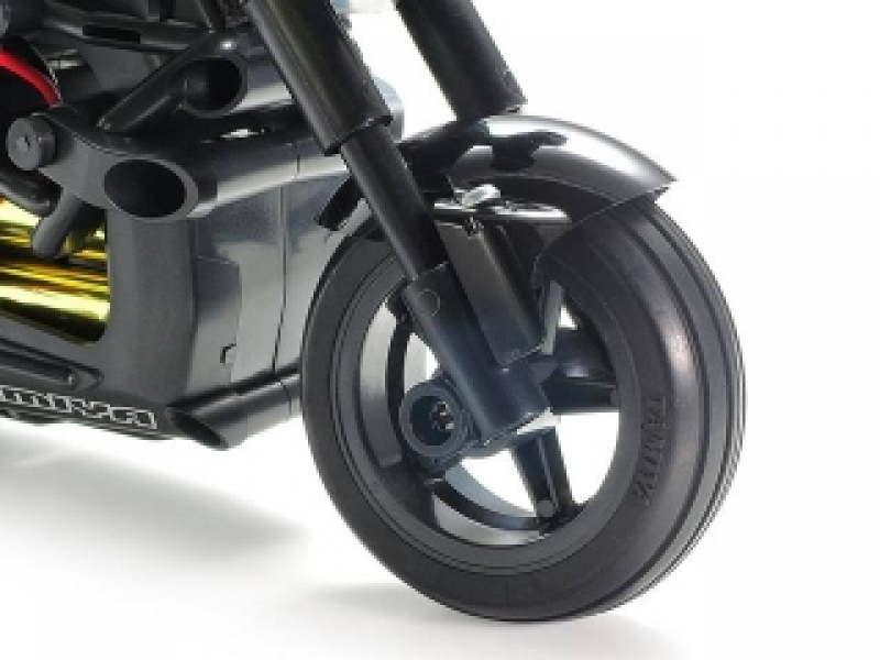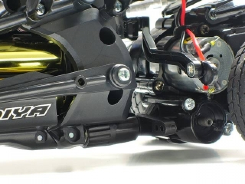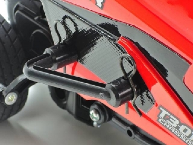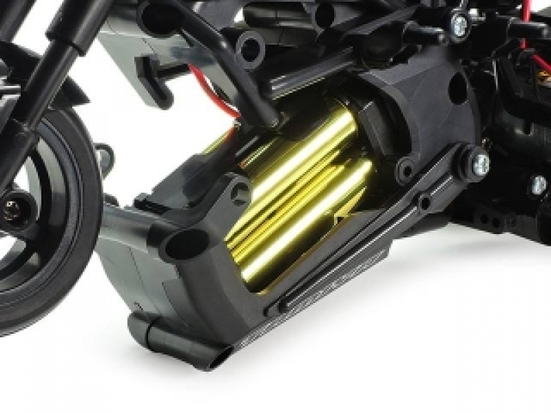 【 自力で起き上がる機能を搭載した3輪シャーシ、T3-01を採用 】 シャーシは、車体を傾けてのアクションあふれるコーナリングが特徴のT3-01。RCメカやバッテリーを搭載したフロントセクション、モーターとギヤボックスを一体化したリヤセクションで構成され、前後のセクションを回転するロール軸で連結。フロントセクションに搭載したサーボの動きをリンクで伝え、リヤセクションを動かす反作用で、フロントセクションを左右に傾ける動きを生み出します。また、万一転倒しても送信機の操作だけで自力で起き上がるのも注目のポイント。その機構は、コーナリング用サーボに取り付けられたサポートアーム。転倒した時、倒れた方向にステアリングホイールをいっぱいまで回すと、サーボの動きと連動したサポートアームが動くことで車体の重心位置が変わり、車体が立ち上がります。立ち上がる動作は見ていて楽しく、コーナリングと合わせて、その操作にきっと夢中になるでしょう。サスペンションは、フロントがバイクらしい形状と機能を持たせたテレスコピックタイプ。リヤはコンパクトなレイアウトの中にサスペンションとダンパー機能を盛り込んだ「カムスライド・サスペンション」を装備。リヤアクスルには旋回性を高める「プラネタリーデフ」を内蔵して、狭い室内でも軽快な走りが楽しめます。