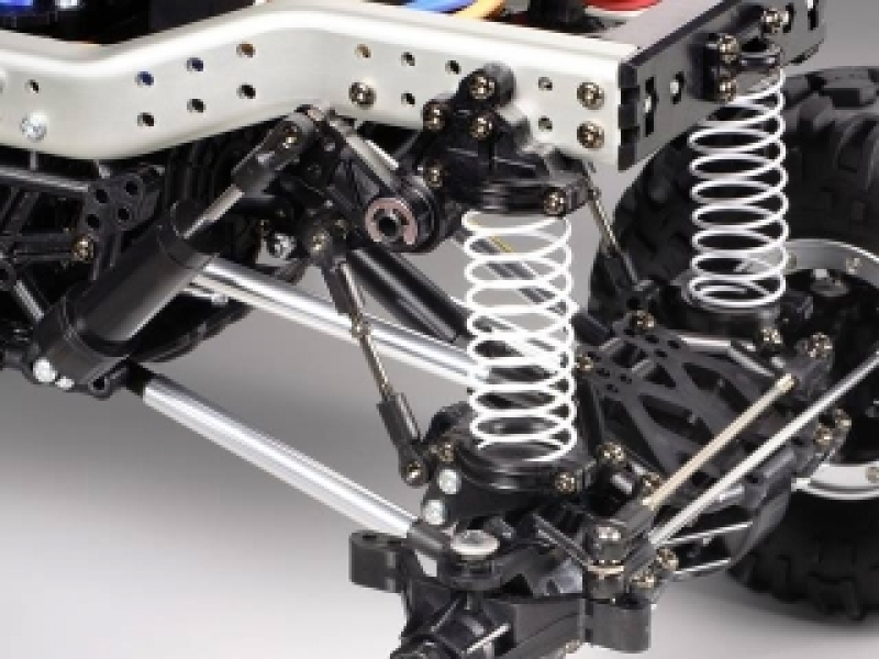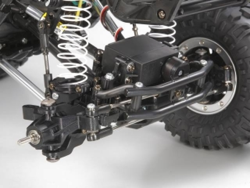 【 基本スペック 】 ●全長435mm ●全幅265mm ●全高274mm ●車体重量2330g ●ホイールベース=288mm ●トレッド=前後とも208mm ●タイヤ幅/径=前後とも57/125mm ●フレーム=アルミ製サイドメンバーに樹脂製クロスメンバーを組み合わせた高剛性ラダーフレーム ●駆動方式=縦置きモーター・シャフトドライブ4WD ●デフギヤ方式=前後:3ベベル(基本セッティングはデフロック) ●トランスファー=プラネタリータイプ ●サスペンション=前後とも4リンクリジッド ●ダンパー=前後ともCVAオイルダンパー ●ギヤ比=40.5:1 ●スピードコントローラー=ESC仕様(別売) ●モーター=RS540タイプ